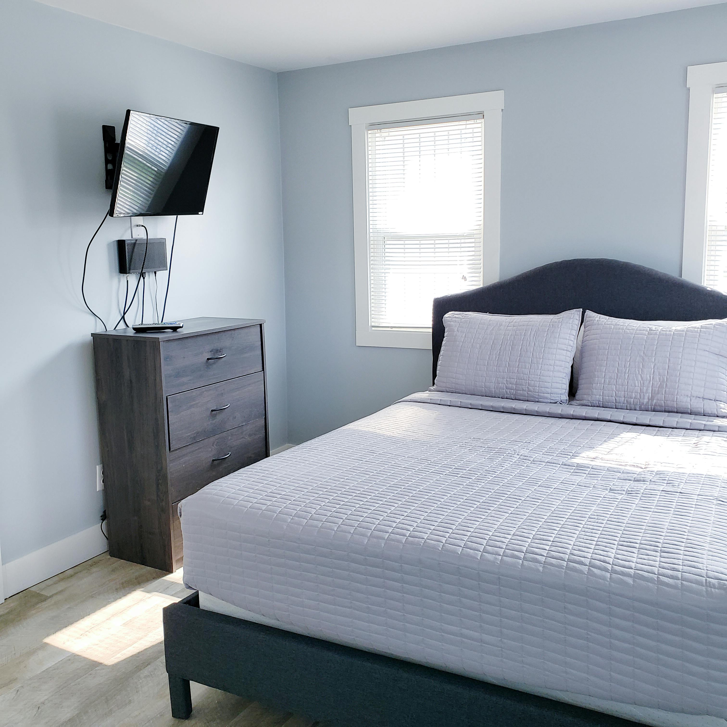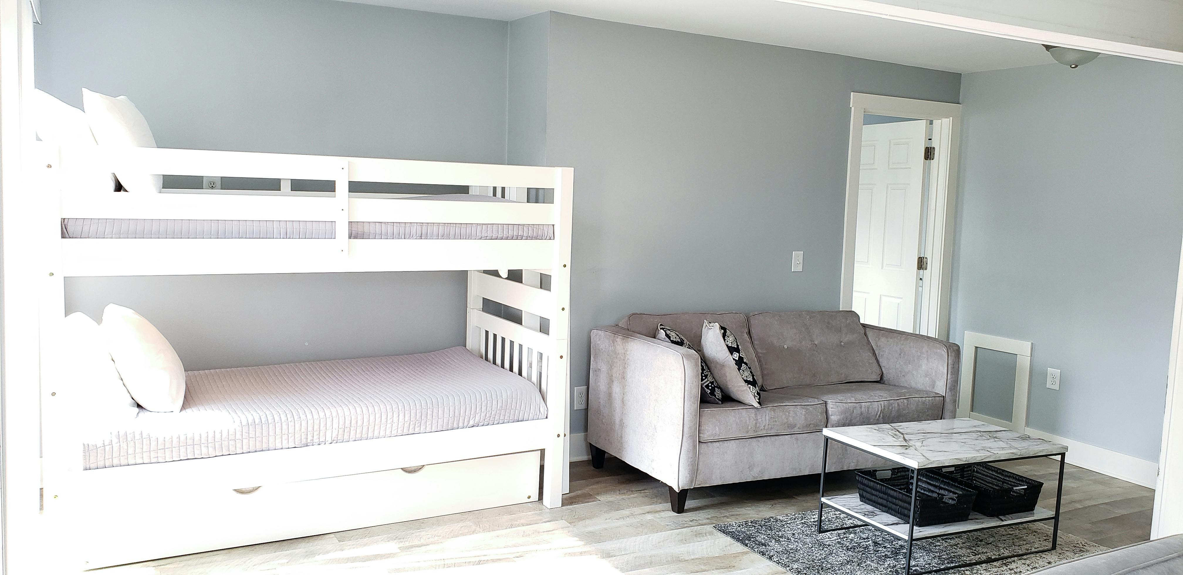 Newly renovated bi-level loft suite located behind the main lobby featuring a full kitchen and 8-person dining table, one private bedroom with queen bed and living room. The living room features a bunk bed with trundle and two sofas with full-sized pull out beds. Full bathroom, tub and two closets. PLEASE NOTE: this unit features a spiral staircase to reach the second level (living and sleeping area) and is NOT suitable for any persons with mobility issues. All rooms at the resort feature cable tv, free wifi, coffee makers and a breakfast option.